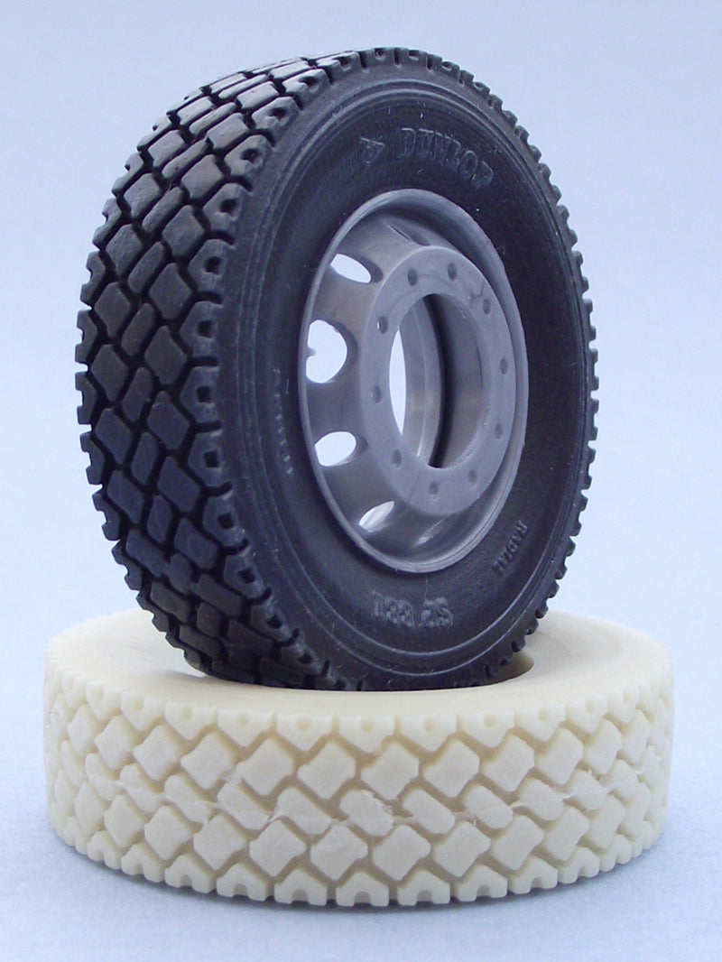 A Pair of drive axle resin tyres. Suitable for direct replacement of Italeri standard tyres and all Italeri later type 2-part rims. Also suitable for KFS-277 and KFS-278 2-part split rims.