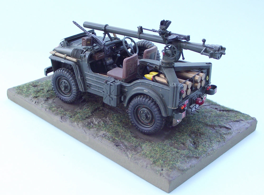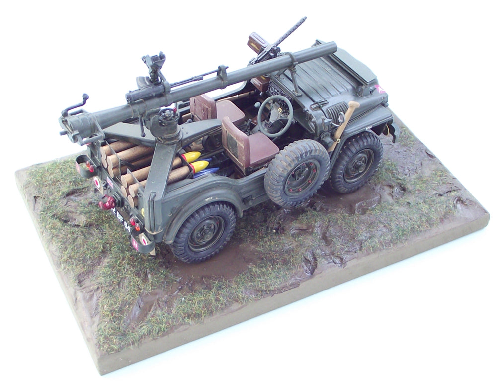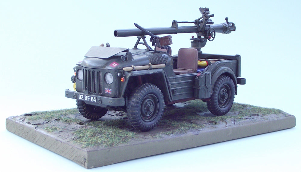 However, because the two rear legs of the tripod are width adjustable, the kit will also easily fit most 1/24th scale Jeep kits, the KFS Lightweight Airportable, the Italeri 3 Series Land Rover kit & most open backed civilian pick ups. The model is demountable from the carrying vehicle & comes with the standard monowheel tripod carriage.