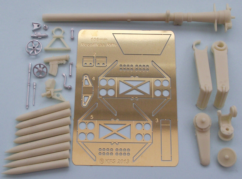 The model has barrel traverse & elevation & comes with a total of 8 rounds of the unique perforated case 106mm ammo. 4 Rounds of HESH & 4 Rounds of HEAT plus an ammo rack for Champ use. The ammunition for this kit has been specially CAD drawn & rapid prototyped & has the correct number & size of perforations in each shell case.