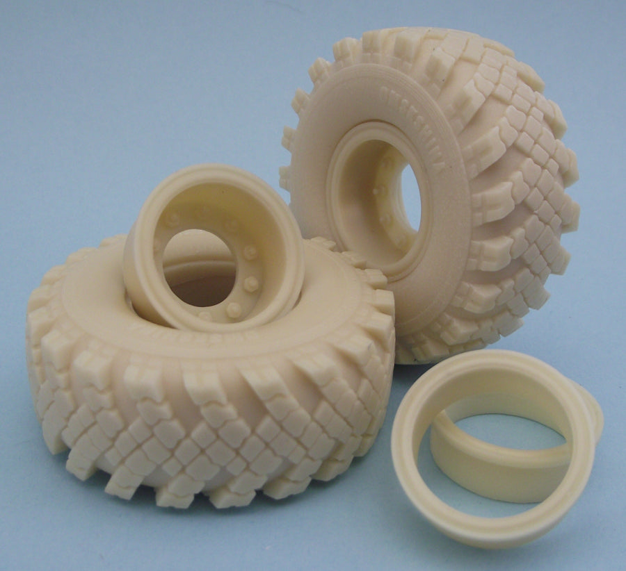 A pair of Russian style 'Omskshina' V tread off road tyres, 50mm diameter x 16mm wide, with separate 2-part wheel. Fits all KFS TQH1 to H15 hubs