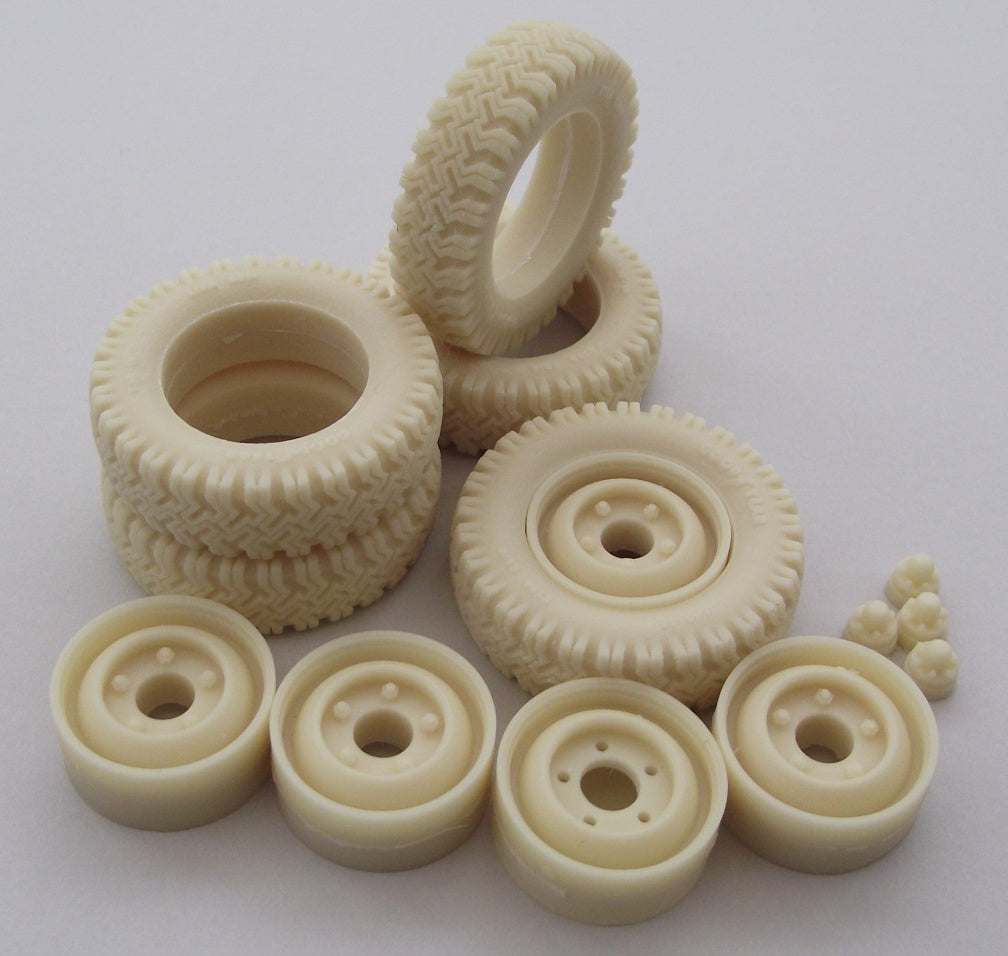 A 14-part set from our Series 2a Land Rover Ambulance kit. This set consists of 5 tyres, 4 road wheels, 1 spare wheel, and 4 hub centres.
