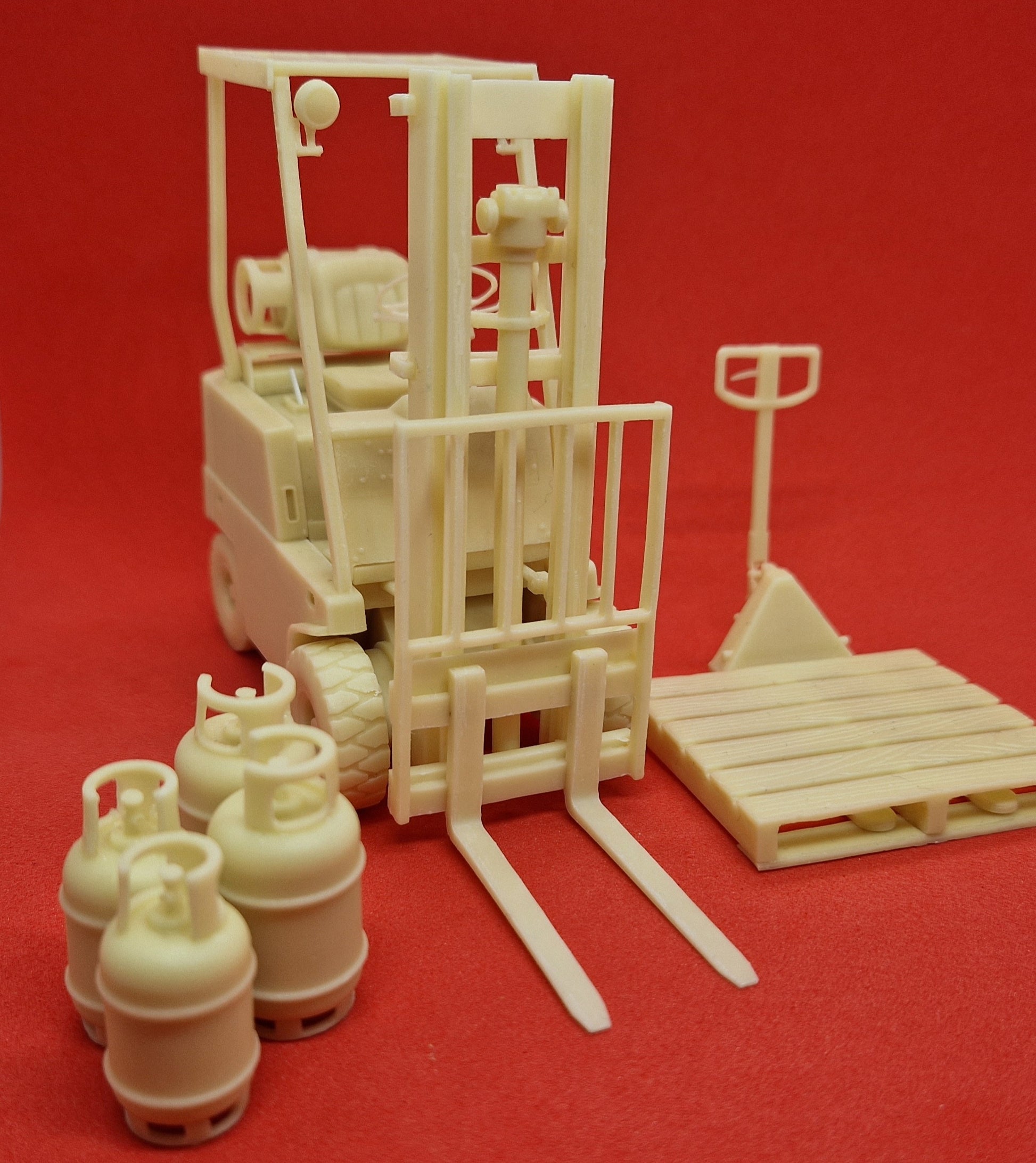 These multi-part resin kits, including a Forklift Truck, based on 1980s type, a Pump Truck, Gas Cylinders and one pallet, are a perfect combination for industrial dioramas, including loading the rear of any curtain side truck scene, or as a stand alone project. For additional Pallets, you can add the KFS Pallets.