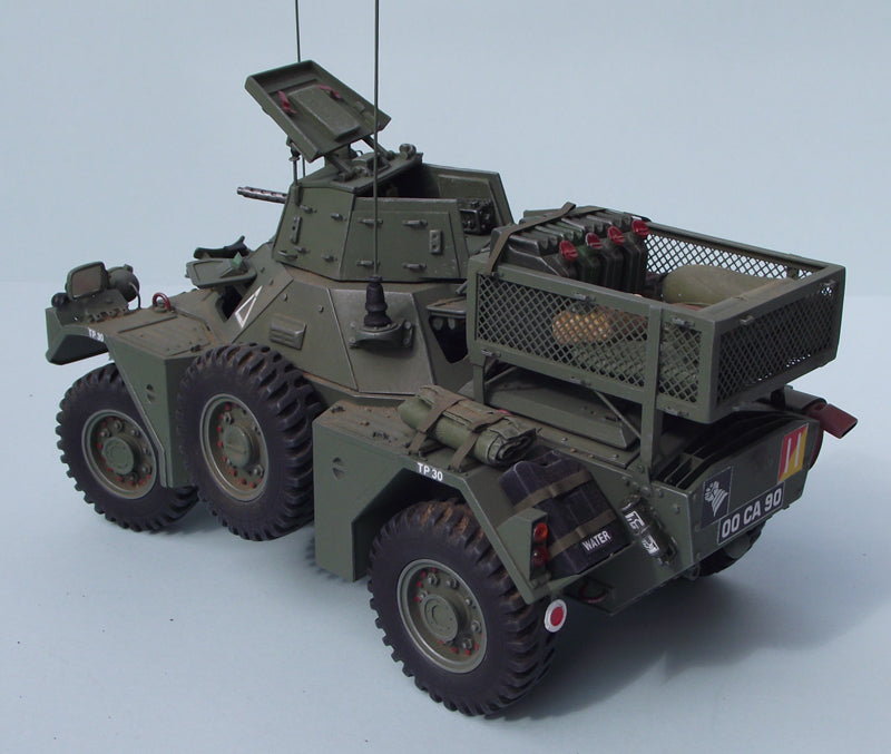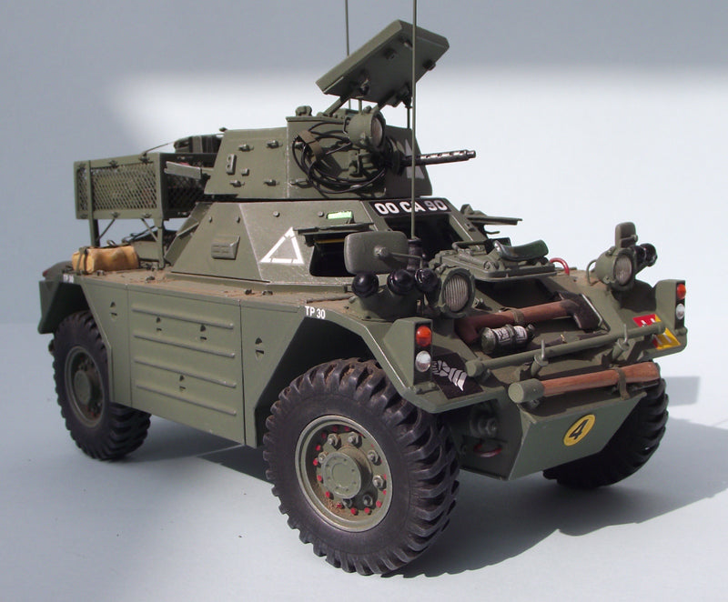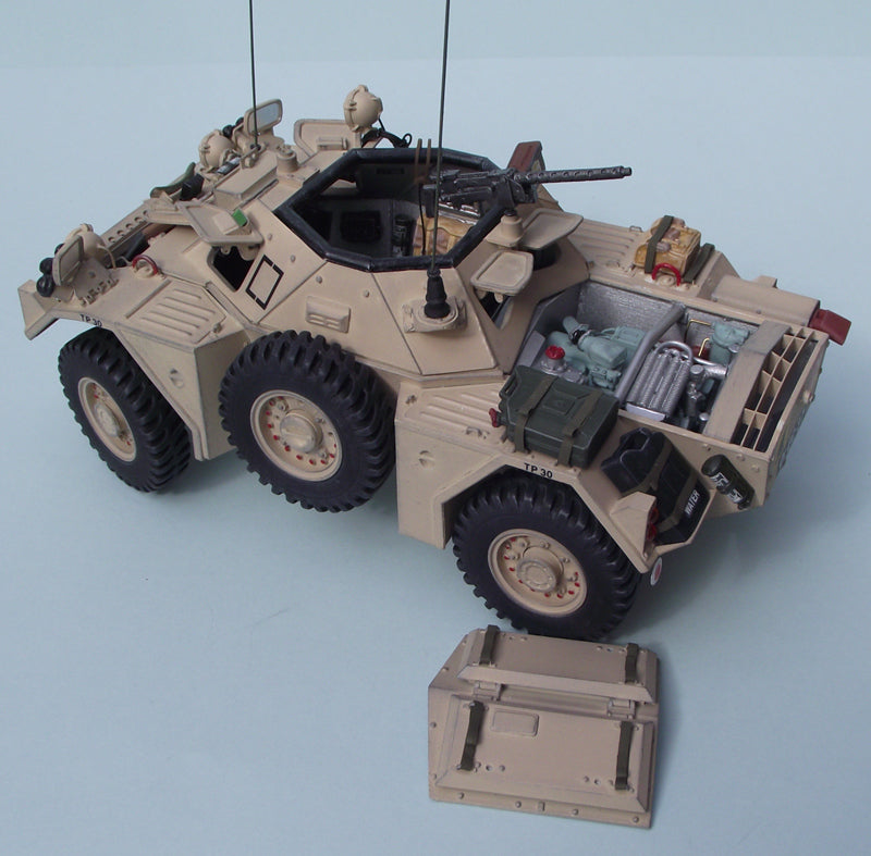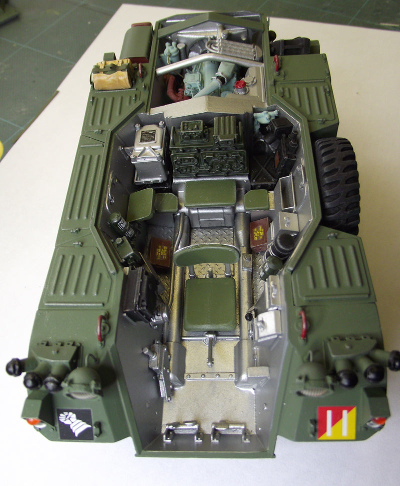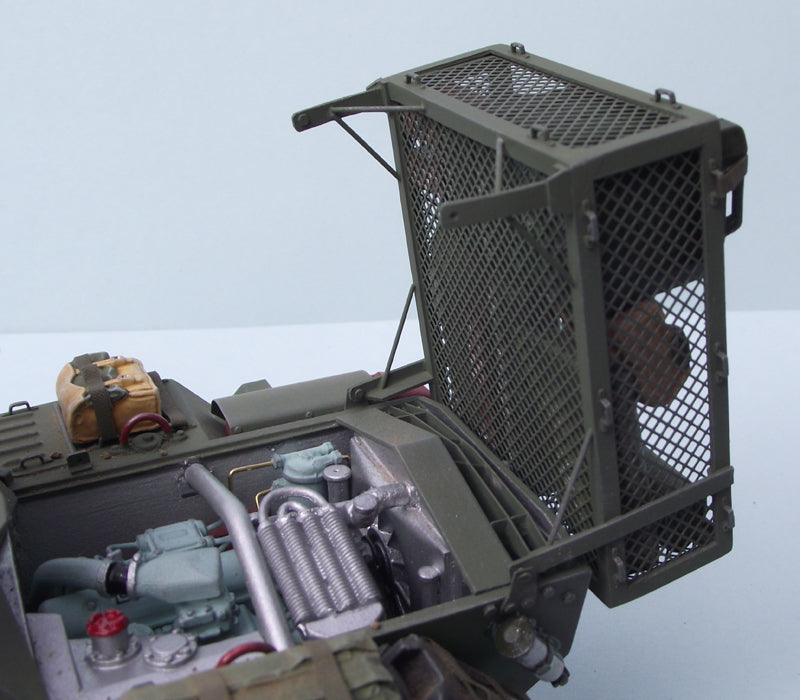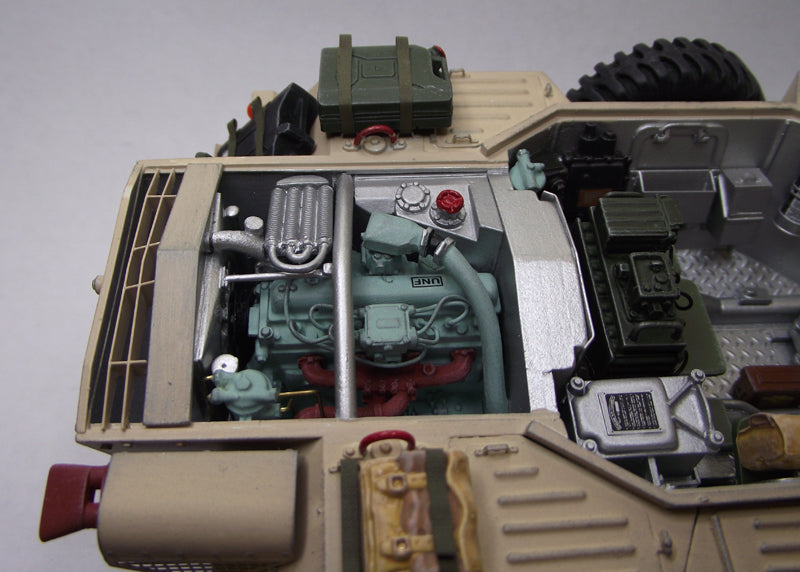 Poseable steering & front/rear hatches with optional windscreen cover. Fully detailed turret with.30 cal MG, & highly detailed interior including C42 & B47 radio sets, drivers controls, stowage etc. Hinged &/or complete lift out engine decks to reveal a fully detailed engine bay with complete Rolls Royce B60 engine.
