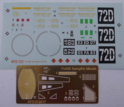 The kit includes the FV438 armoured rear bins, reversed rear door, optional periscope sight position, fully detailed turret interior, missile re-supply bins, detailed sight and firing controls, crew seating and Swingfire missile. A small number of etched brass parts, waterslide decals. Several display options and full instructions included.