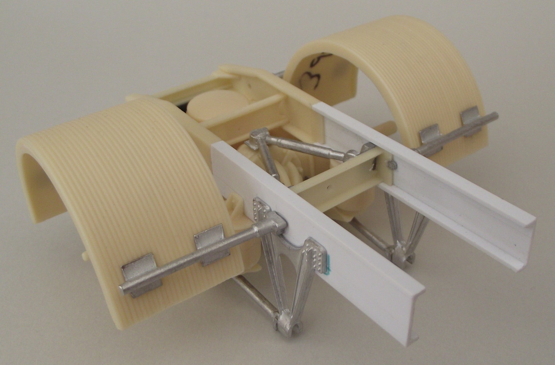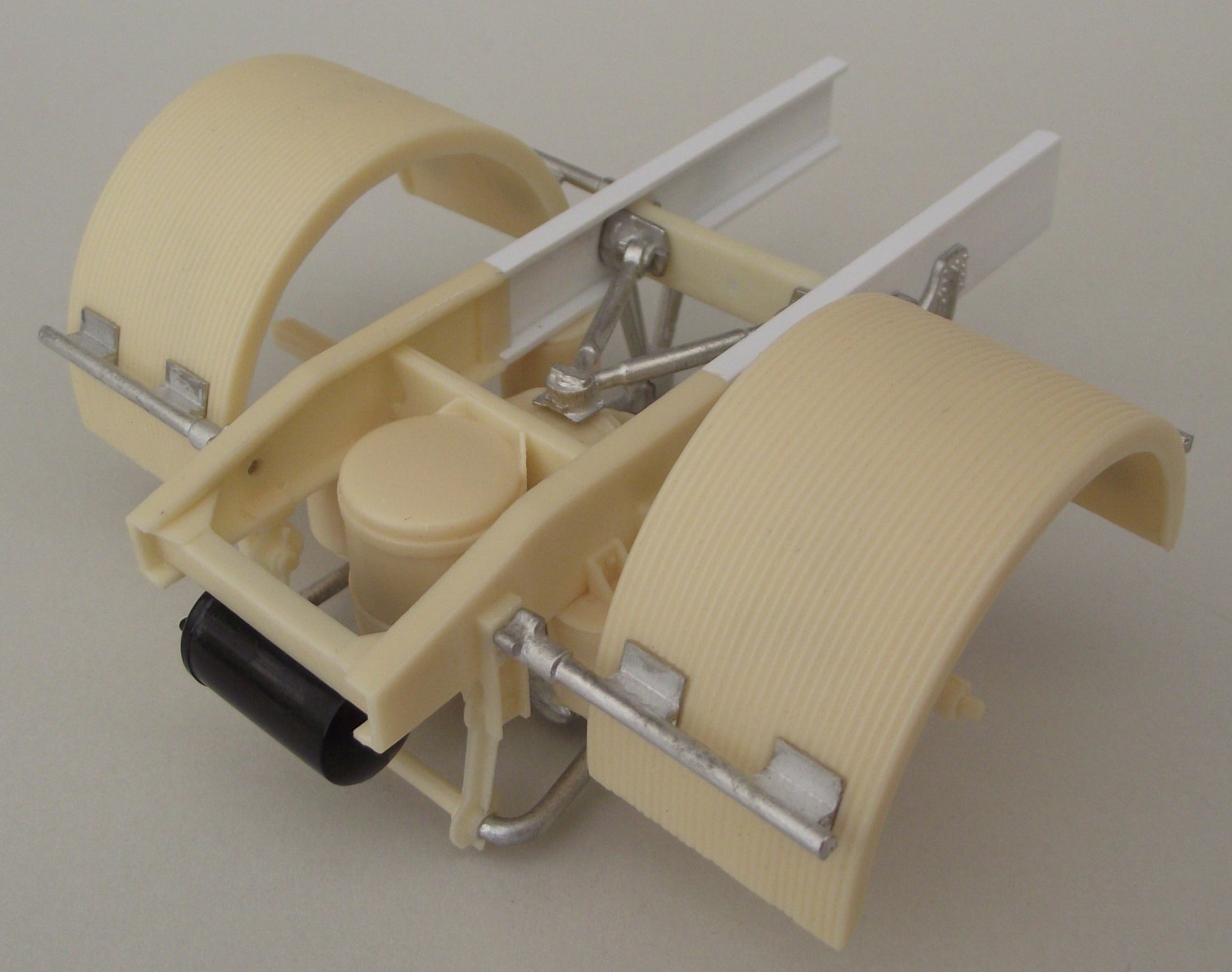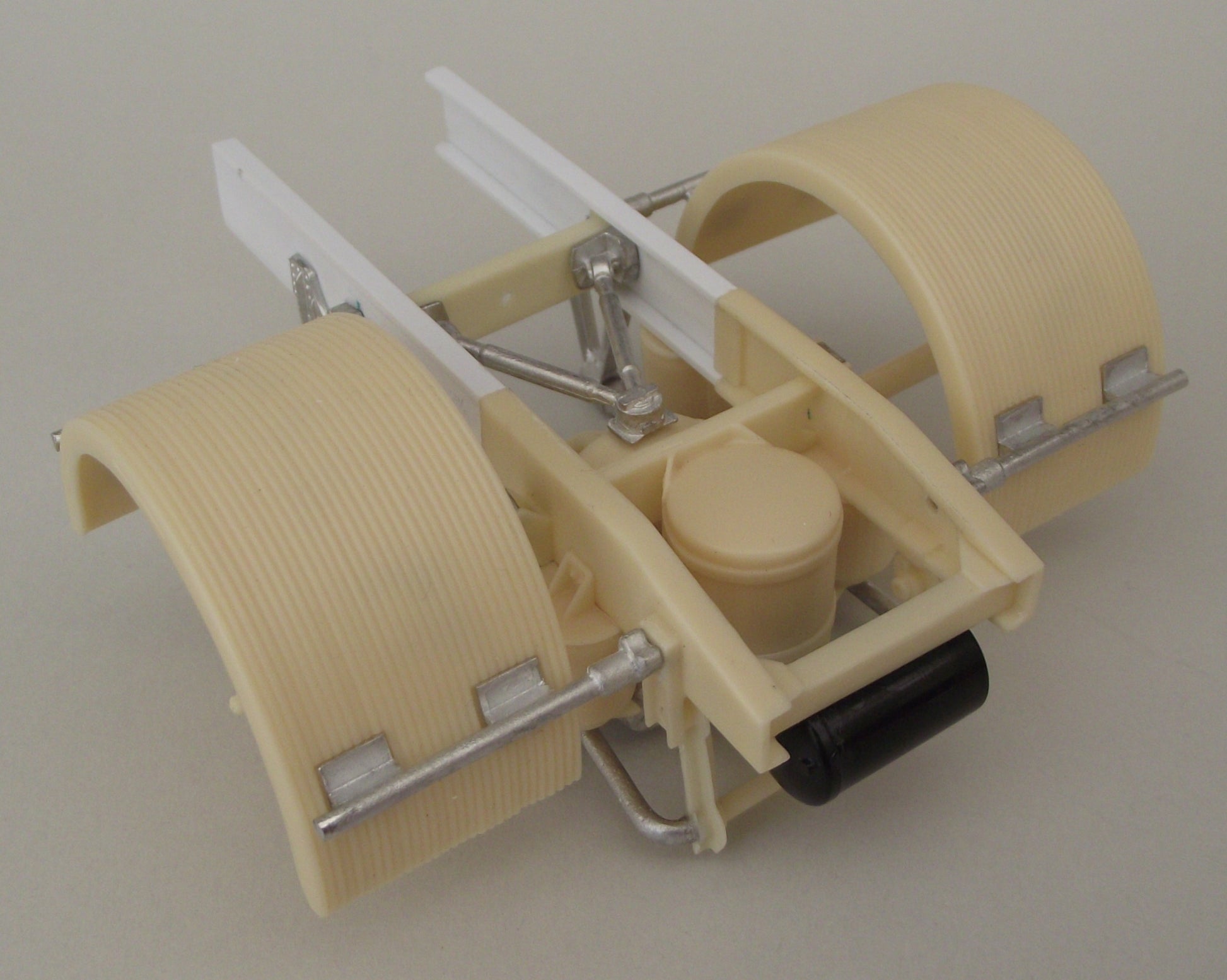 Image shows extension of chassis rails (in white in the image) as an example/assembly guide only. The air tank mounted at the rear (in black in the image) can be found in the parts of the plastic kit being converted, and is not included in this kit.