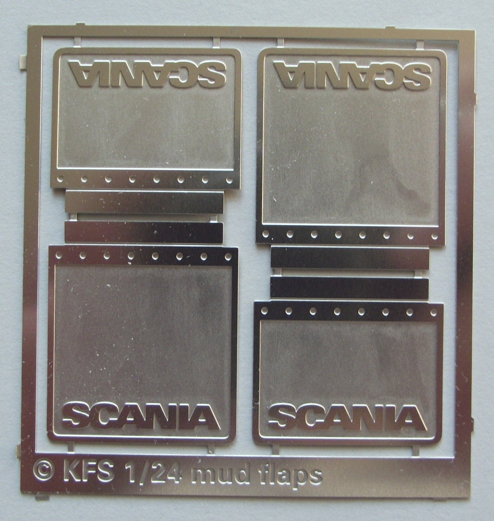 A set of four etched SCANIA mud flaps. Measurements:24mm wide x 17mm and 24mm deep