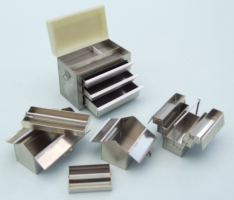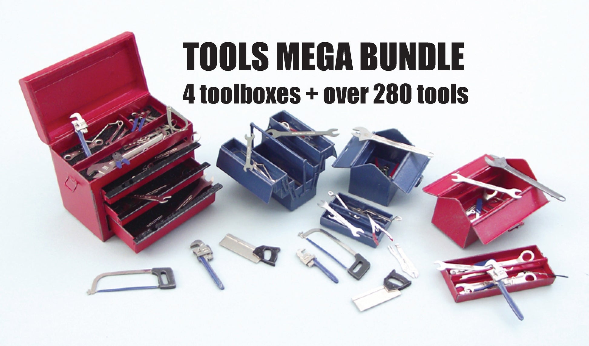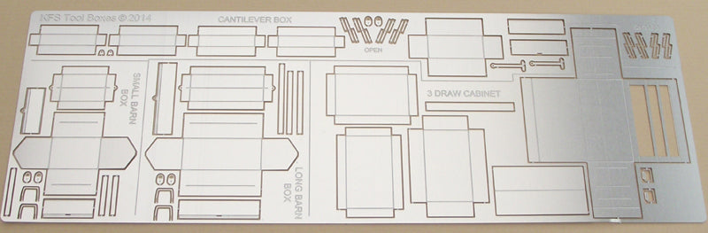 A set of around 172 finely detailed etched spanners, 110 assorted finely detailed etched hand tools, and 4 easy to fold and assemble mechanics toolboxes. All Supplied with detailed instructions.