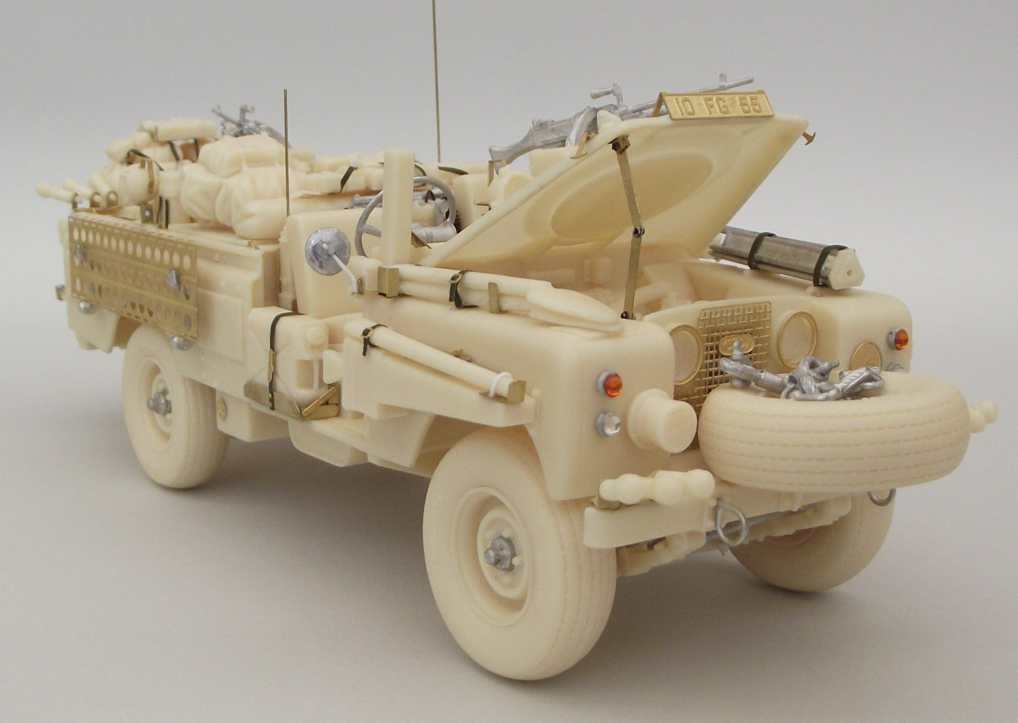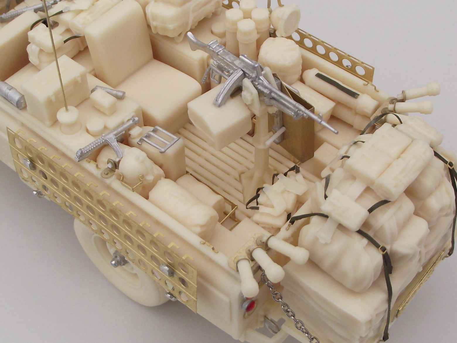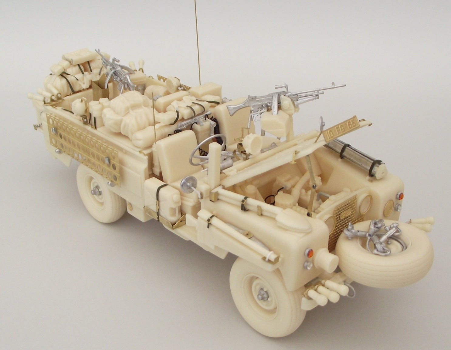 High quality produced parts in resin, parts in cast white metal, parts in brass etch, full colour waterside decals. Features include twin GPMGs and SMG personal weapons, fuel and water can stowage, sand tyres, personal equipment stowage, including SAS Bergens, sleeping bags, and 58 pattern webbing. Also features a detailed sun compass, sand channel PSP, tow cables and shackles, optional number plates, and a fully detailed engine with optional 'hood open' parts included (as shown in the unpainted build).