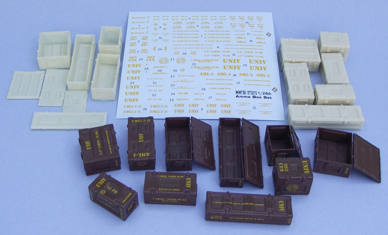 An assorted set of ten 1/24th ammunition boxes (three of which are also found in our 5.5" gun kit). Six boxes are cast closed and four are hollow with removable lids.