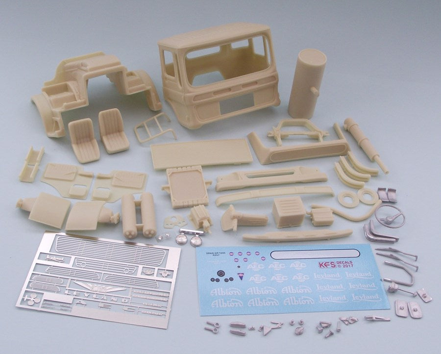 This kit includes 32 parts in polyurethane resin, 31 parts in white-metal & 29 parts in photo-etch nickel silver. It also includes optional badging for AEC, Albion & Leyland; (Mandator, Mammoth, Marshal, Mercury, Comet, Octopus & Beaver, Super.) Glazing, headlights, waterslide decals & full colour instructions supplied.