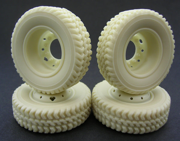 A set of 4 Axle heavy duty split rim wheels, 43.5mm diameter x 14mm wide tyre, with Unitrak off road tyres. Moulded in one piece. Fits all KFS TQH1 to H15 hubs