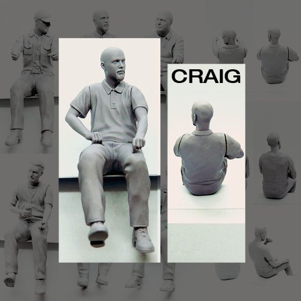 1/24th seated male figure, in driver or passenger pose. Posable arms also allow for different steering wheel positions and fits. Figure can suit most standard cabs (or other 1/24th scale vehicles), but adjustments may need to be made (using either warm water or a hairdryer taking care not to burn yourself) to adjust leg positions to suit desired position and certain cabs builds. (Any adjustment with heat should be done with care.) Figures can be adjusted to better suit Right or Left hand drive vehicles, and others are more generally suited to passenger positions.