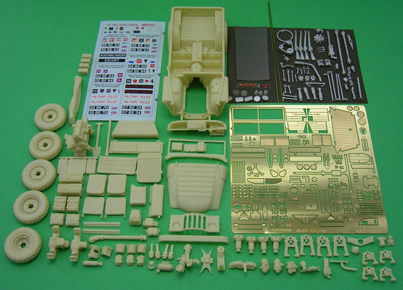 90 parts in high quality resin, 64 in white metal & 185 in etched brass. Optional folded resin hood or erected vac-formed hood provided, pre-coloured tail lights & indicators, glazing & woven wire radiator mesh. Full pictorial build instructions included.