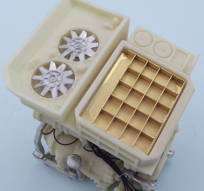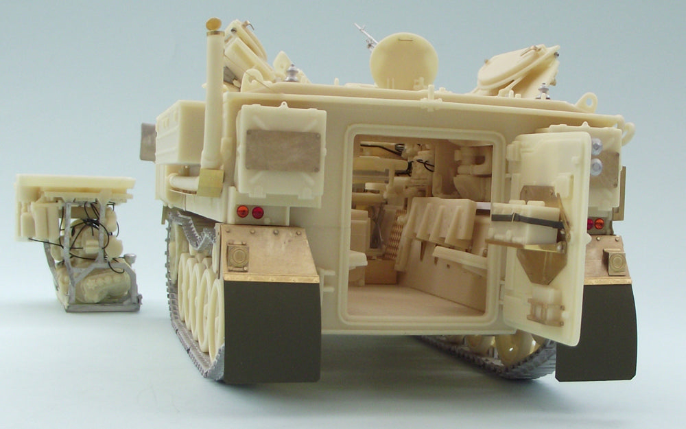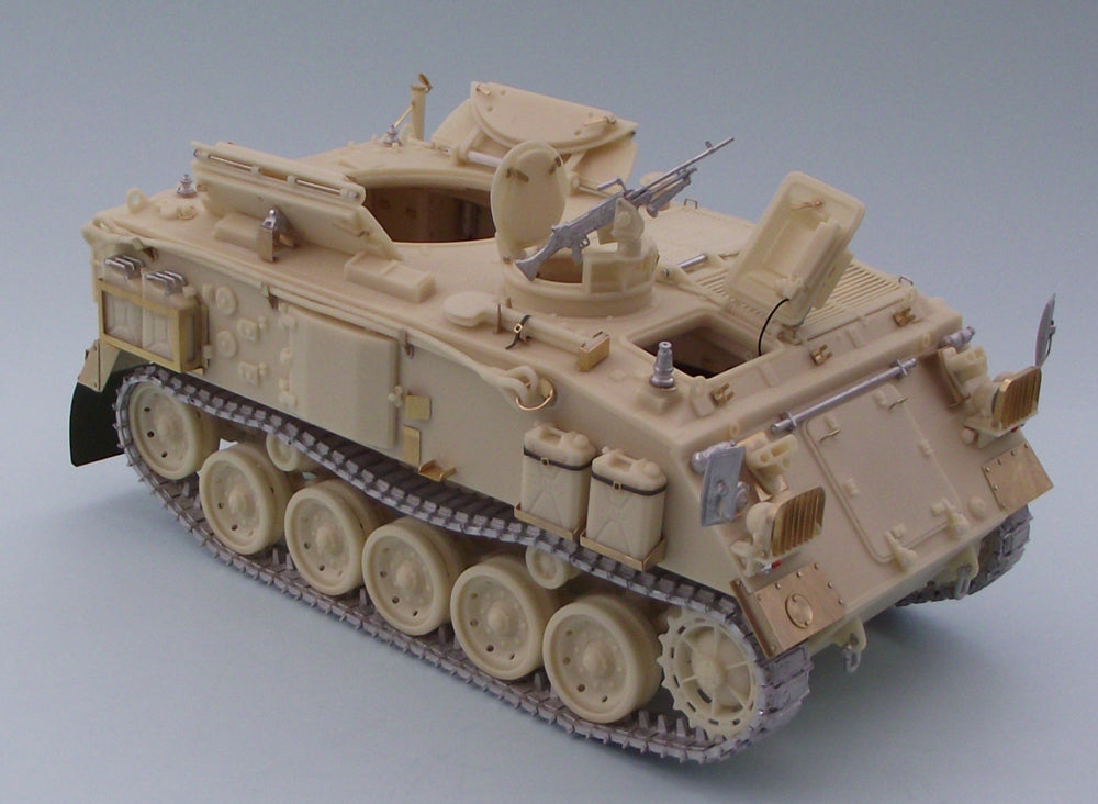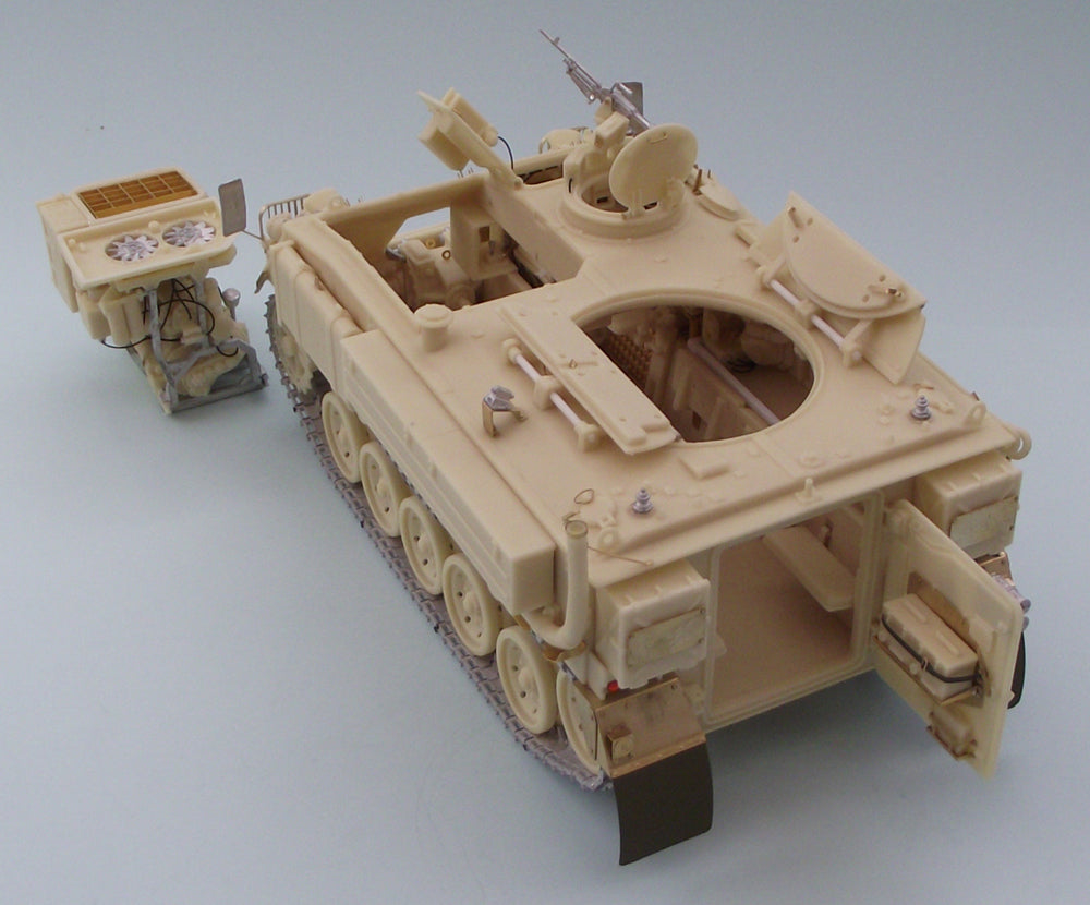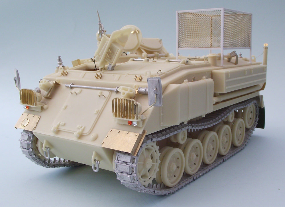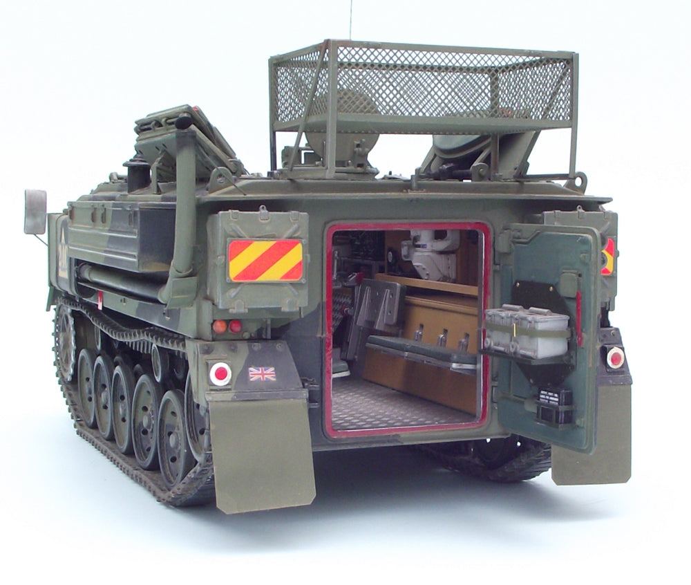 This model kit is fully detailed inside and out, complete with folding crew seats, detailed drivers station, Larkspur C42 radios, removable engine decks and a lift out K60 power pack. All doors and hatches are working...rear door, commanders hatch, drivers hatch, folding mortar hatch and front access panel. For complete accuracy and the highest level of fine detail, the tracks and sprockets have been CAD drawn and Rapid Prototyped & the tracks are cast in resin as individual links.