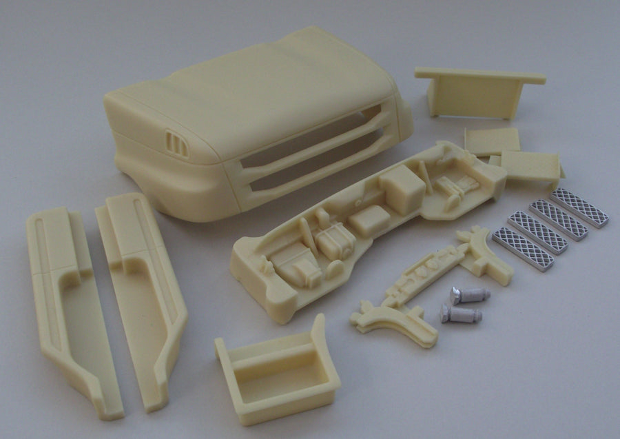 1/24th Scale Scania T cab conversion kit of resin and white metal parts for the most recent face lifted Italeri Scania R Series kits. Kit includes hood, firewall, cab side finishing panels, front and rear cab mounts, and metal steps. Supplied with instructions.