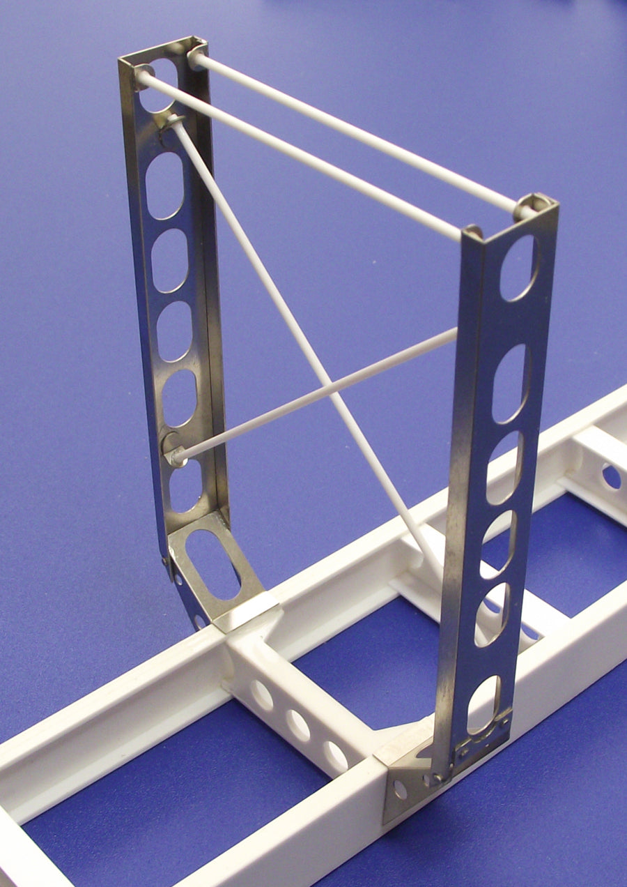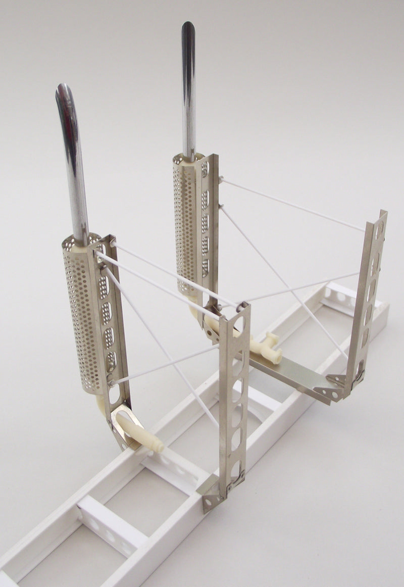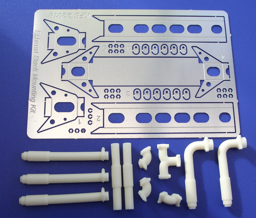A set of exhaust stack mounting brackets complete with an 11-part set of highly detailed KFS-336 (TQ157) link up pipes in resin. Mounting set includes optional chassis side mounts or cross chassis platform mount and plastic bracing rod. Supplied with instructions